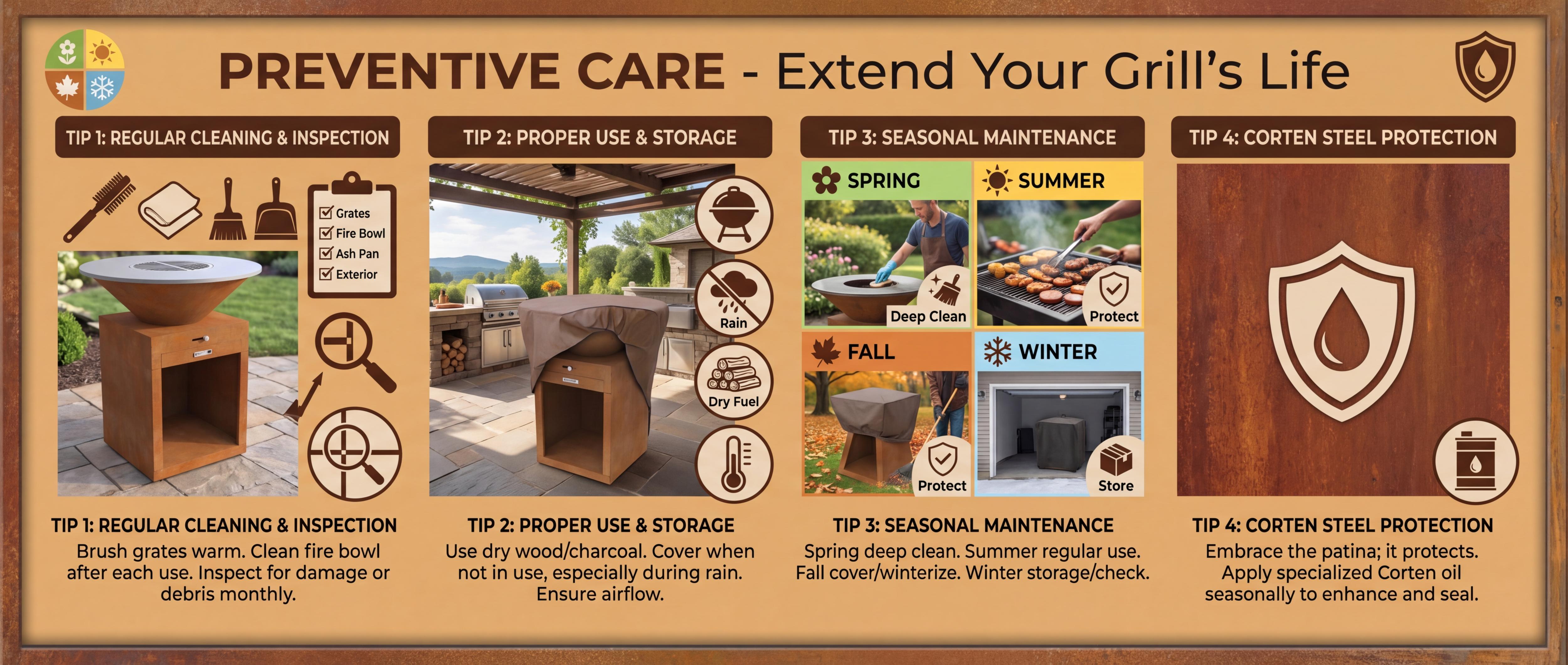 Preventive maintenance is the most effective way to ensure your Corten outdoor grill remains fully functional and looks its best for years to come. Unlike reactive repairs, proactive maintenance minimizes downtime, reduces costs, and extends the overall lifespan of your BBQ grill.